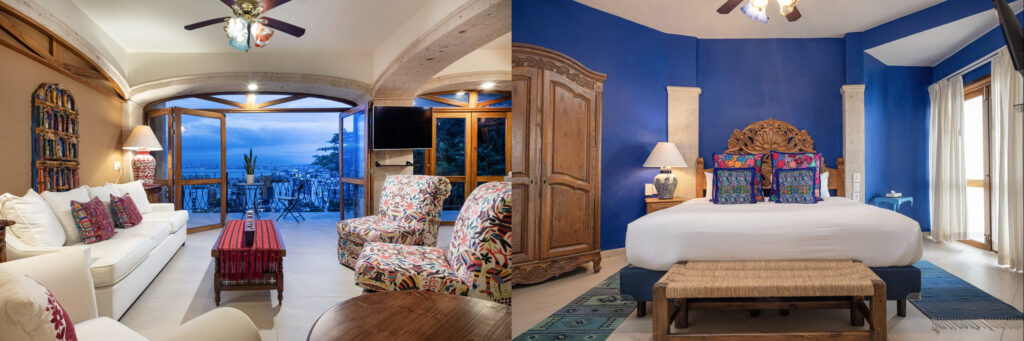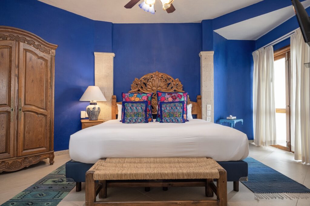 Two Bedroom Royal Blue Palace in the Sky: The royal palace in the sky we call Penthouse Azul features one-of-a-kind furniture dressed in a variety of blues—a deep blue L-shaped sofa you can sink into, a separate plush over-sized chaise lounge chair, and two richly painted blue king bedrooms. You can enjoy sweeping sea and